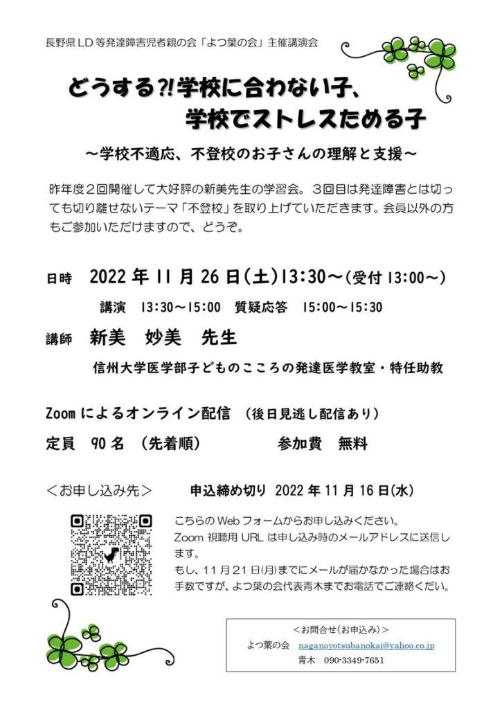 11月26日オンライン開催│どうする?!学校に合わない子、学校でストレスをためる子【信大医学部特任教授・新美先生】