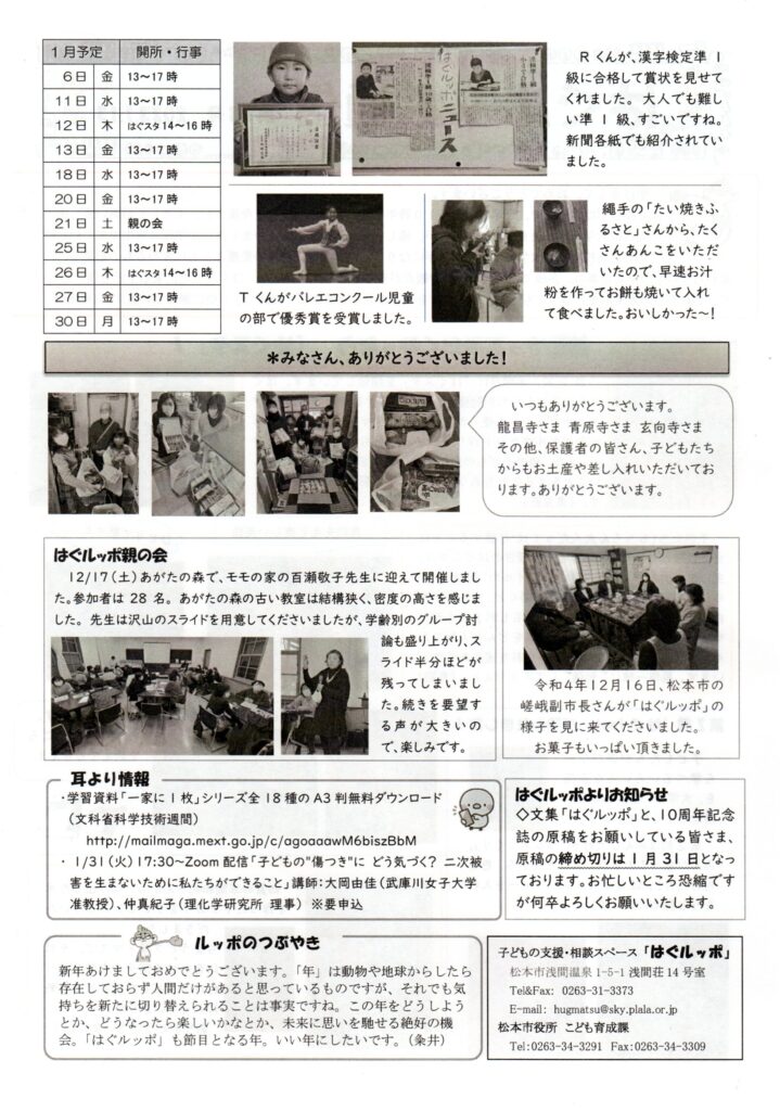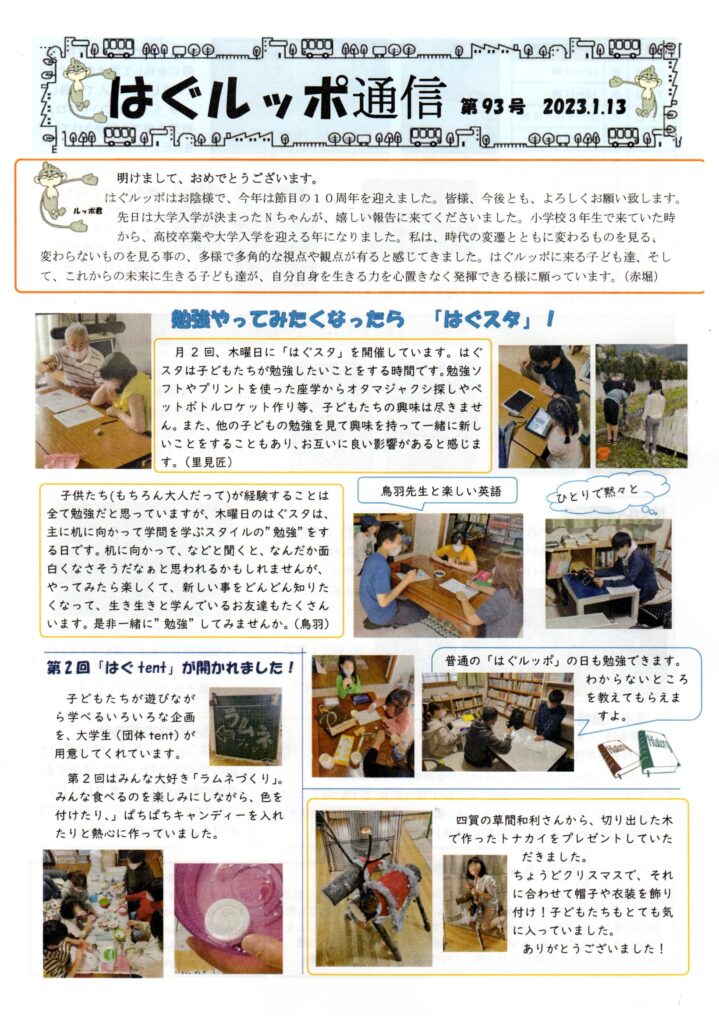 はぐルッポ通信93号を発行しました 2023 1/23 お知らせ 2023年1月19日 2023年1月23日 お知らせ はぐルッポ通信(第92号)を発行しました はぐルッポ通信第94号を発行しました 関連記事 はぐルッポ通信 第97号を発行しました 2023年7月6日 はぐルッポ通信 第97号を発行しました 2023年5月24日 はぐルッポ通信 第96号を発行しました 2023年5月24日 はぐルッポ通信第95号を発行しました 2023年5月24日 はぐルッポ開所日カレンダー 5月、6月 2023年5月24日 はぐルッポ通信第94号を発行しました 2023年2月12日 はぐルッポ通信(第92号)を発行しました 2022年12月10日 はぐルッポ通信(第91号)を発行しました。 2022年11月17日